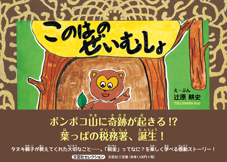 ポンポコ山の親子タヌキがつくる葉っぱ税務署のふしぎを描く、
